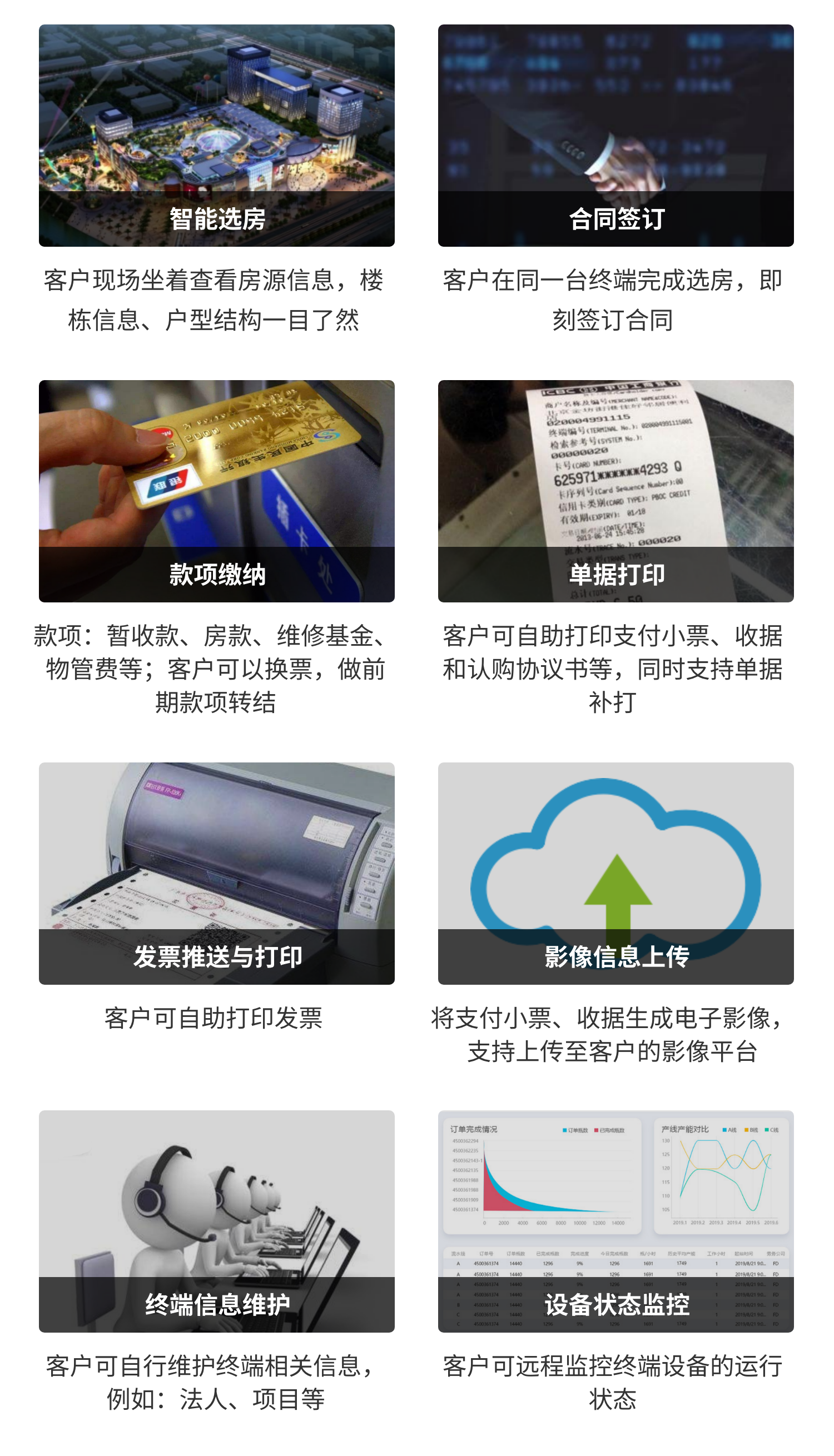 證通智慧地產解決方案系統是公司為房地產開發商客戶定制的一款售樓處收款賬務一體化的綜合解決方案。系統通過與地產公司內部0A系統、財務系統、房管局系統稅務系統等多個地產公司內外部系統進行對接,集成刷臉支付、微信、支付寶、銀行卡等多種支付渠道,支持客戶使用人臉識別、身份證、指紋進行身份確認,提供選房合同簽訂、繳款、單據查詢打印、記賬、退費、影像信息上傳、設備狀態監控、終端管理、數據統計和報表推送等的全流程買賣房服務,讓數據多跑路,讓客戶少跑路,實現房費輕松繳、客戶零等待、開心買賣房!