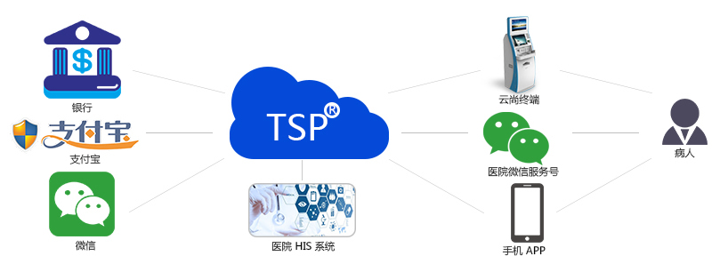 TSP平臺打通了醫院信息管理系統(HIS)、銀行、微信、支付寶,在支撐就醫自助終端、微信服務號、手機APP業務實現的基礎上,還具備終端的遠程運維管理、交易監控、消息分發(微信、短信、郵件、APP)、報表統計、應用管理等功能,為客戶提供全方位的增值化服務。