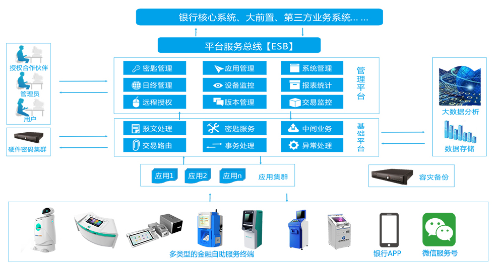 TSP平臺打通了銀行核心系統、第三方業務系統、微信,支持不同類型自 助終端的部署與多種業務的集成,同時還具備終端的遠程運維管理、交易 監控、消息分發(微信、短信、郵件、APP)、報表統計、應用管理等功 能,為客戶提供全方位的增值化服務。