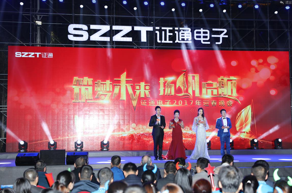 ? 2017118日晚,“筑夢未來·揚帆啟航”證通電子2017年迎春晚會在深圳市證通電子產業園璀璨啟幕。證通電子總裁曾勝強先生攜夫人、證通電子常務副總裁許忠慈先生等領導、嘉賓及公司全體同仁齊聚一堂,共襄盛舉,為2016的累累碩果喝彩,也為2017的熱血出征燃起熊熊之火。