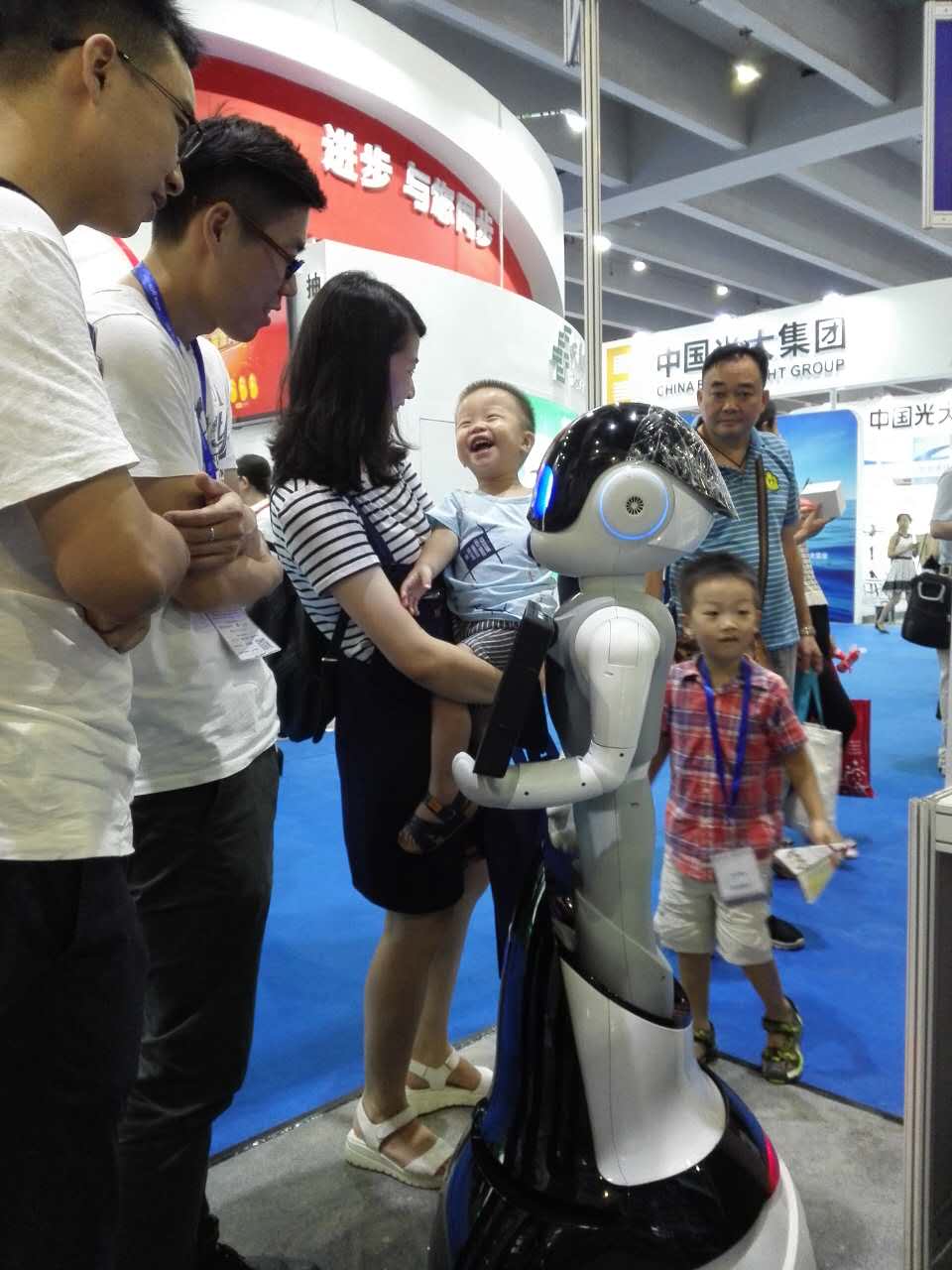 展會現場,不知誰家的小萌娃被FINBOT逗得直樂呵。