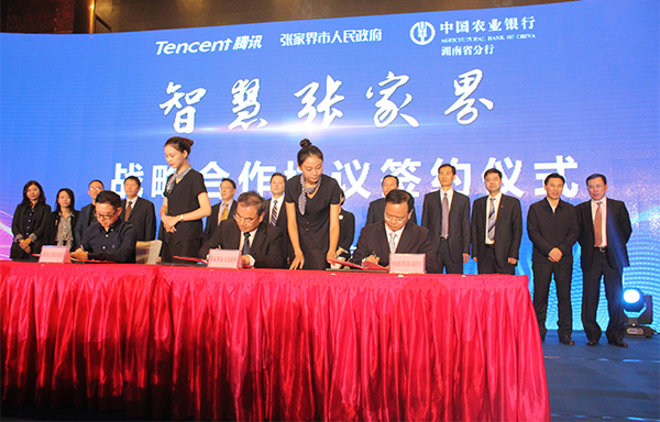 2017年11月3日,張家界市人民政府、深圳市騰訊計算機系統有限公司、中國農業銀行股份有限公司湖南省分行、深圳盛燦科技股份有限公司、深圳市證通電子股份有限公司聯合舉辦的“智慧張家界”戰略合作協議簽約儀式暨湖南省農行“智慧鄉村”發布會在張家界陽光酒店隆重召開。