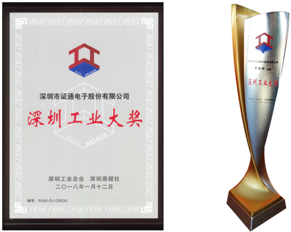 2018年1月12日,深圳工業創新成果發布會暨深圳工業總會 2017 年度年會在五洲賓館隆重舉行。在會上對第三屆“深圳工業大獎”、2017年度“履行社會責任杰出企業”、2017年度“深圳百優工匠”企業進行了表彰,證通電子斬獲“深圳工業大獎”企業獎和企業家獎雙料大獎