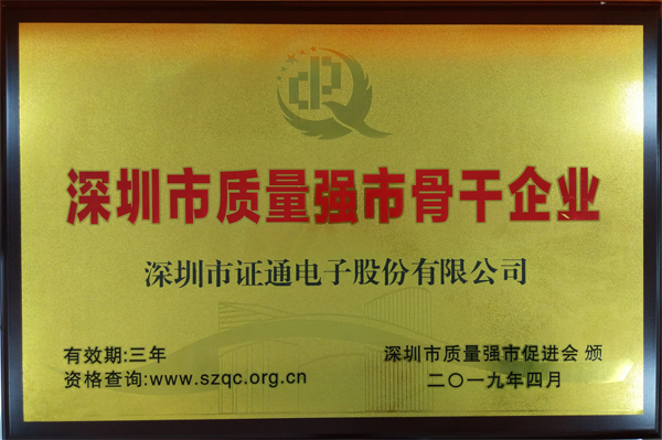 2019年4月28日下午,由深圳市質量強市工作領導小組辦公室指導,市質量強市促進會主辦的2019年深圳市質量強市促進大會暨質量強市建設年度盛典在市民中心舉行。會上對深圳市證通電子股份有限公司等第四批“深圳市質量強市骨干企業”進行了公示表彰。