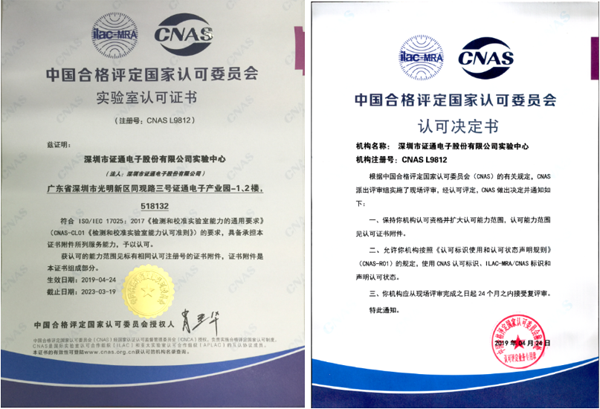 近日,深圳市證通電子股份有限公司實驗中心通過了中國合格評定國家認可委員會(CNAS)的復評認可,此次復評主要涉及體系的換版及檢測能力的擴項,這不僅標志著證通實驗室中心在硬件設施和軟件條件達到了國家認可水平,同時在管理水平和檢測能力又上升了一個臺階,出具的檢測數(shù)據(jù)和報告具有權威性和公正性,并能得到全球50多個簽署國際實驗室合作認可組織(ILAC)互認協(xié)議的成員國和地區(qū)的承認,消除貿易壁壘。