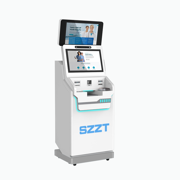 多功能智慧終端-ZT2226-B系列,鮮艷的全彩機身形象,打破了傳統銀醫自助終端的沉悶配色,旨在為醫院打造一片醒目的自助引導區域,無需多余的空間修飾,既可達到引導的目標。整體方正的造型設計,穩重安全,自底通頂的前門結構,實現了完全前維護。頂部四面LED數字屏,可隨時更改顯示內容,全方位展示信息。定制化的功能模塊和UI界面為客戶提供更多選擇,助力智慧醫院平臺構建。