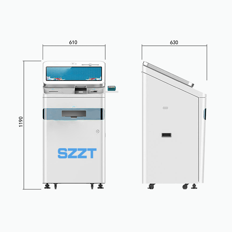 21.5寸幻彩屏幕、高度集成終端,站姿操作,屏幕中心距離地面高度1100mm,屏幕傾角呈水平20°,在此條件下,客戶操作觸摸屏時四肢的移動幅度最小,使用體驗最佳。