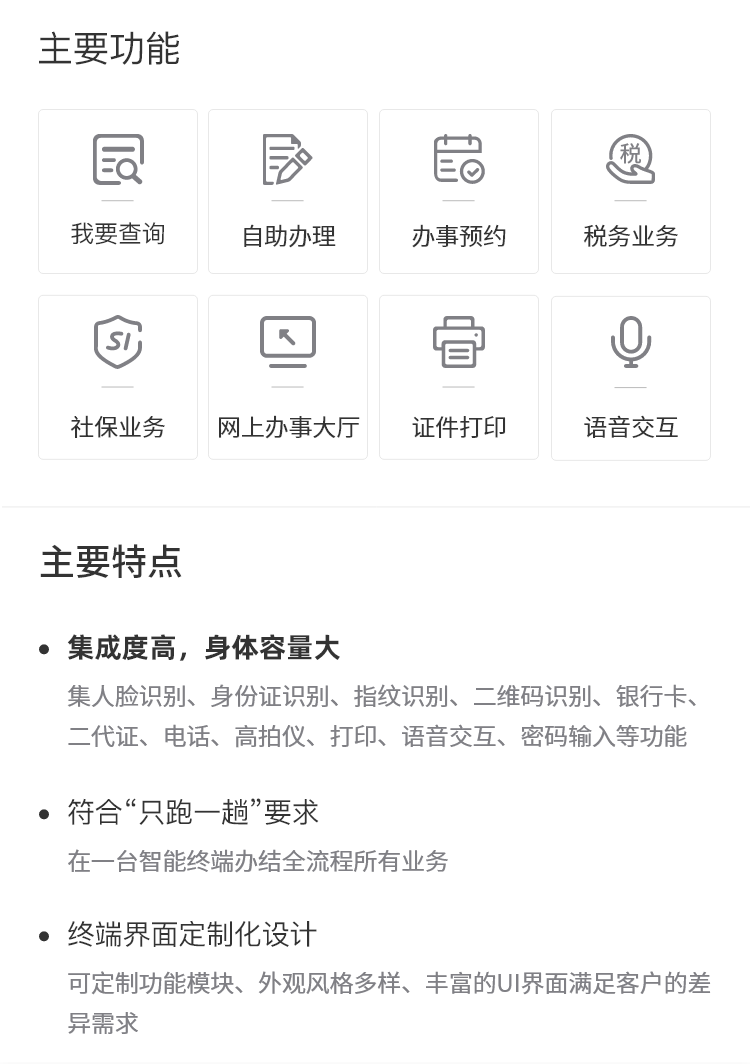 23.8寸屏幕-ZT2X啟系列,23.5寸超炫彩屏,完美將鋼板與亞克力的優勢發揮到極致,體現了終端的高級感,高性能人機交互,兼具二代證、人臉、指紋識別、條碼打印、憑條打印、多種證明打印、銀行卡、密碼鍵盤、查詢等功能模塊,同時還具備自助打印、政務公開、信息發布等功能模塊,功能先進、擴展性強。模塊與UI設計雙定制化,滿足客戶所有需求。
